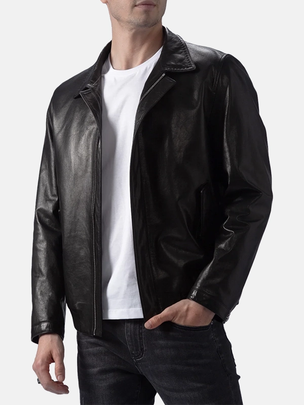 Elegant Folded Collar Black Leather Jacket for Men