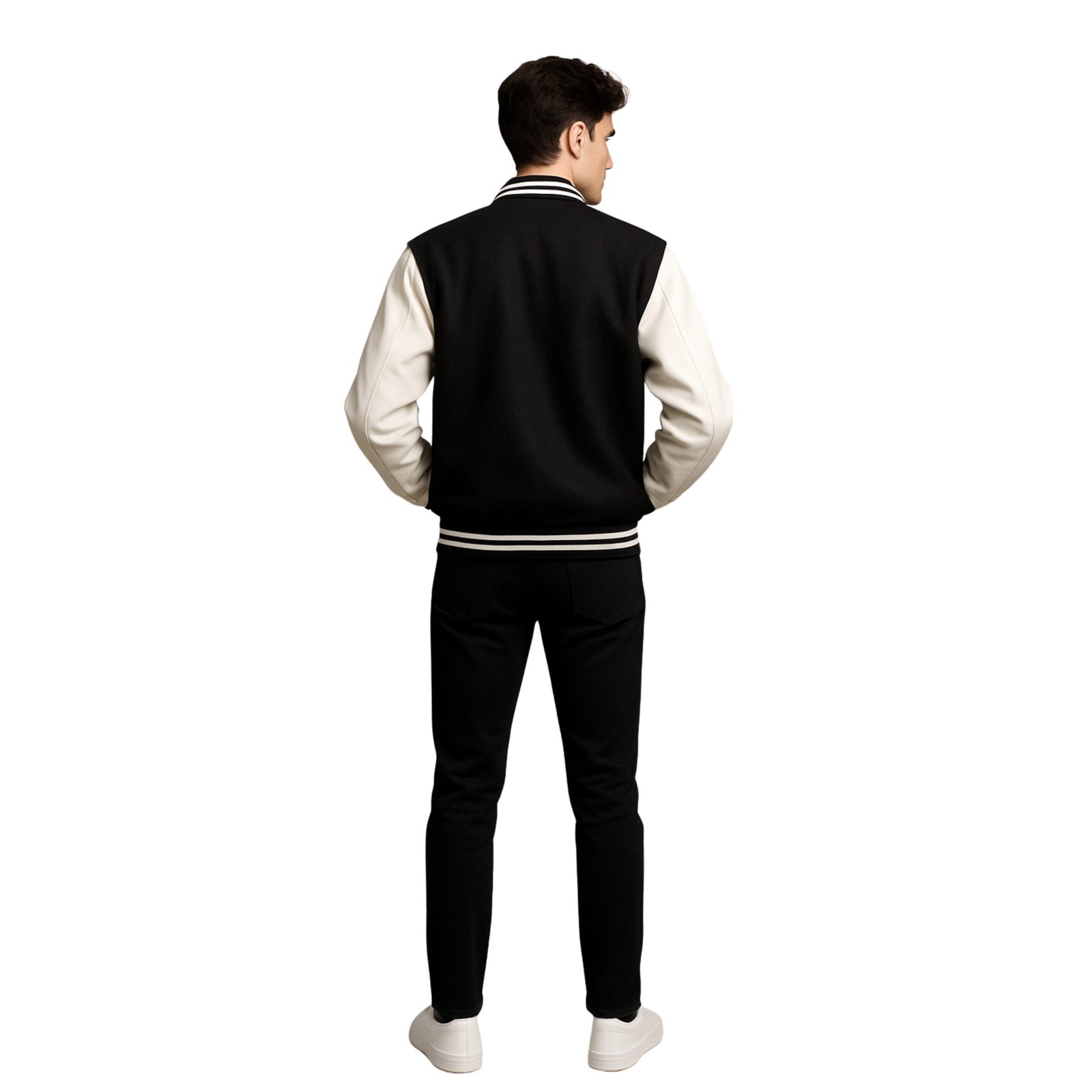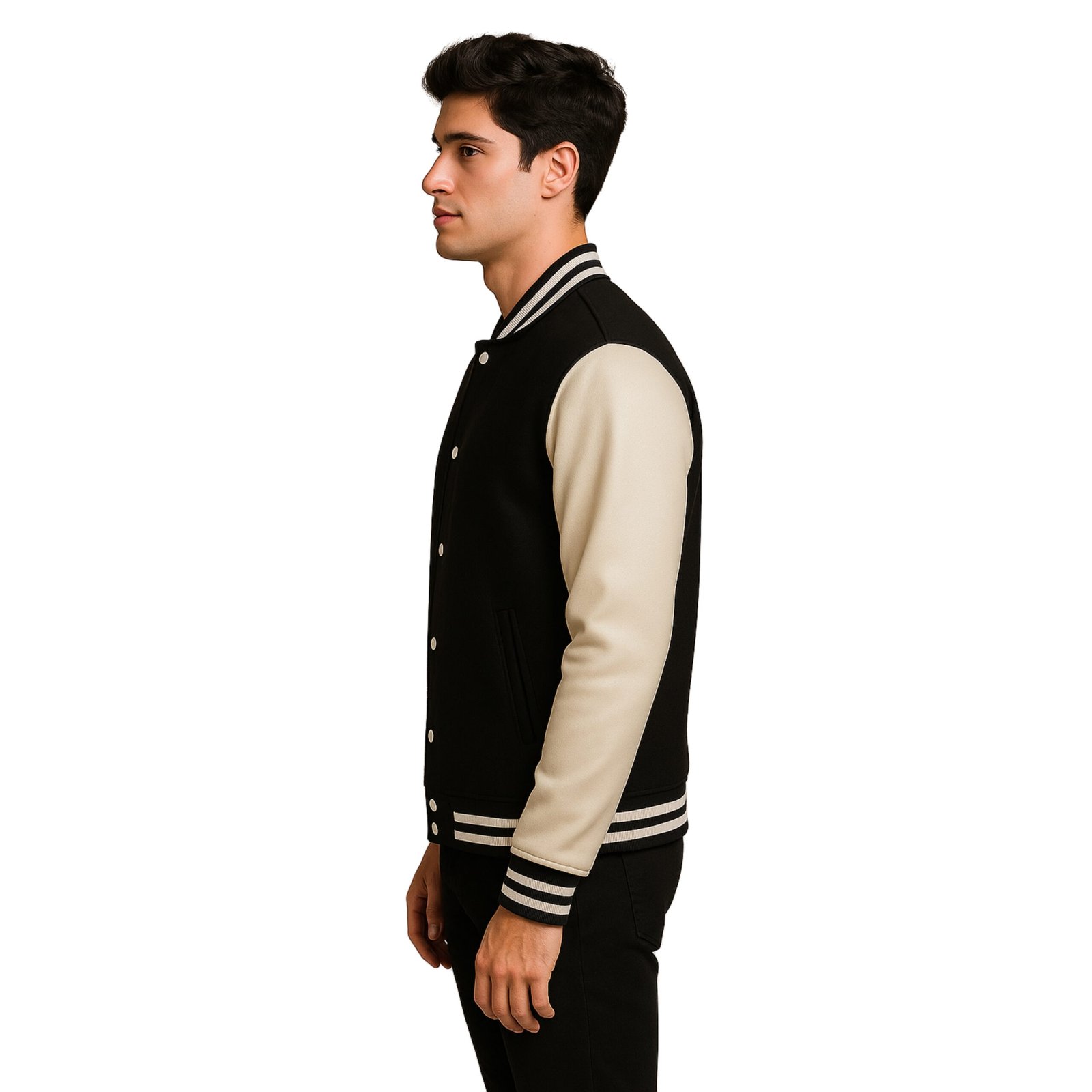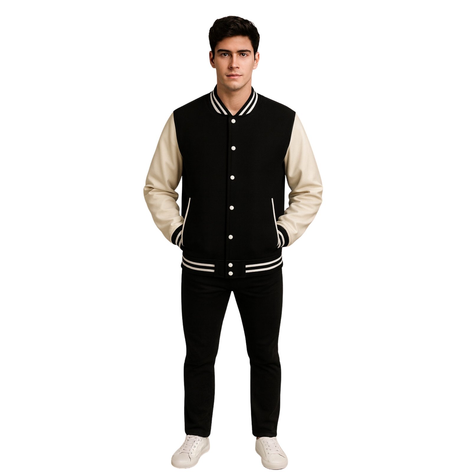 The interior has a viscose liner which provides comfort all day long, and black, beige, and viscose even provide a modern contrast to the jacket. The modern look is further enhanced as the jacket has side pockets which can store easily and provide for a hands-free feature. The pockets also allow quick access to a wallet, keys, and a mobile device. The jacket is casual enough to maintain style and comfort during a casual function at college, with friends, or during a walk, and provide a smart look. The jacket is a perfect combination of style and function. Black and beige provide a neutral and opposing look which can match all wardrobes. This Men’s Black Wool Varsity Jacket is a perfect stylish and warm addition to the wardrobe of every modern man.