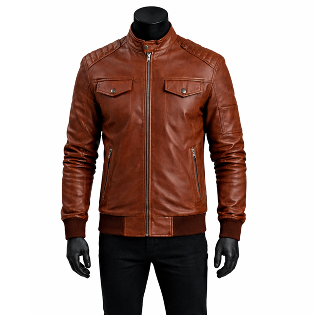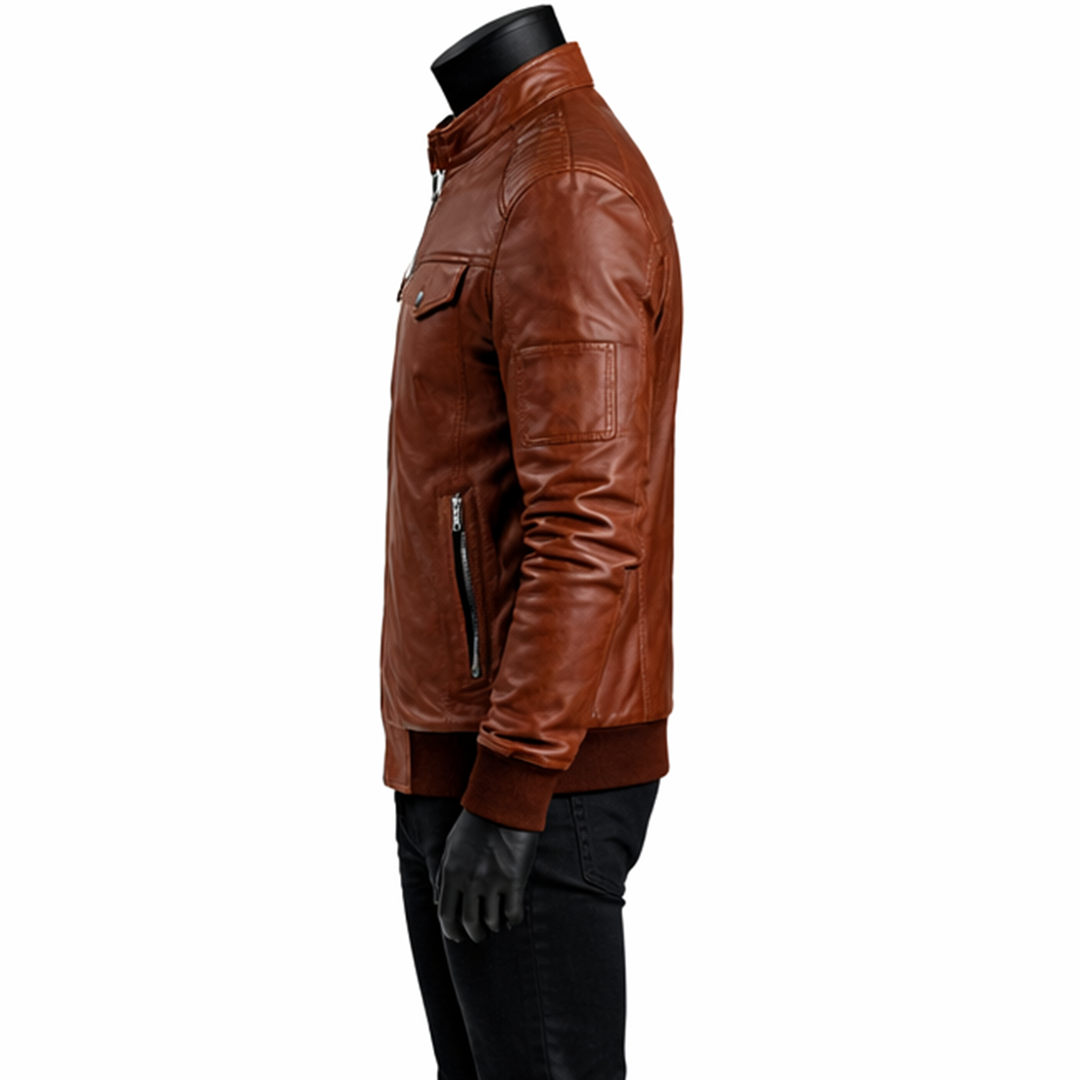 Designed for comfort and functionality, this Men’s Classic Brown Bomber Leather Jacket features a soft inner lining that provides warmth and ease throughout the day. The front zipper closure ensures a secure fit, while rib-knit cuffs, collar, and hem give it the signature bomber structure. Multiple pockets add practicality, allowing you to carry essentials with ease. Its tailored fit suits different body types, offering both comfort and a modern silhouette. Whether paired with jeans or layered over a shirt, this jacket delivers a confident and effortless style that never goes out of fashion.