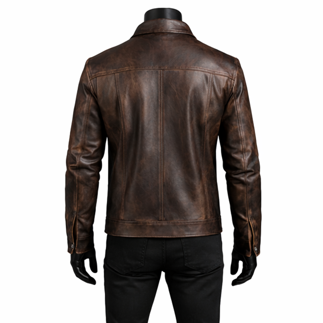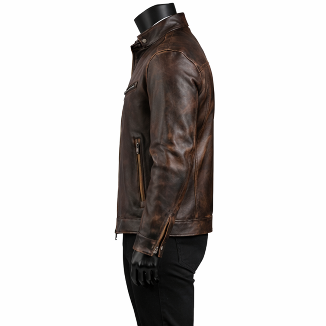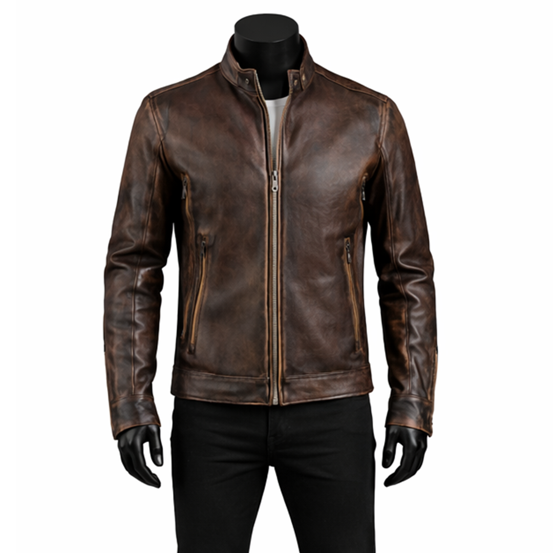 Built for durability and comfort, this Men’s Vintage Motorcycle Brown Leather Jacket includes a soft viscose lining that ensures ease throughout the day. The front zipper closure provides a secure fit, while multiple zippered pockets add both style and functionality. Designed with biker-inspired details like a stand-up collar and zipper cuffs, it delivers a sharp and masculine look. Whether you’re on the road or heading out casually, this jacket offers long-lasting wear, comfort, and a confident vintage aesthetic that improves with age.