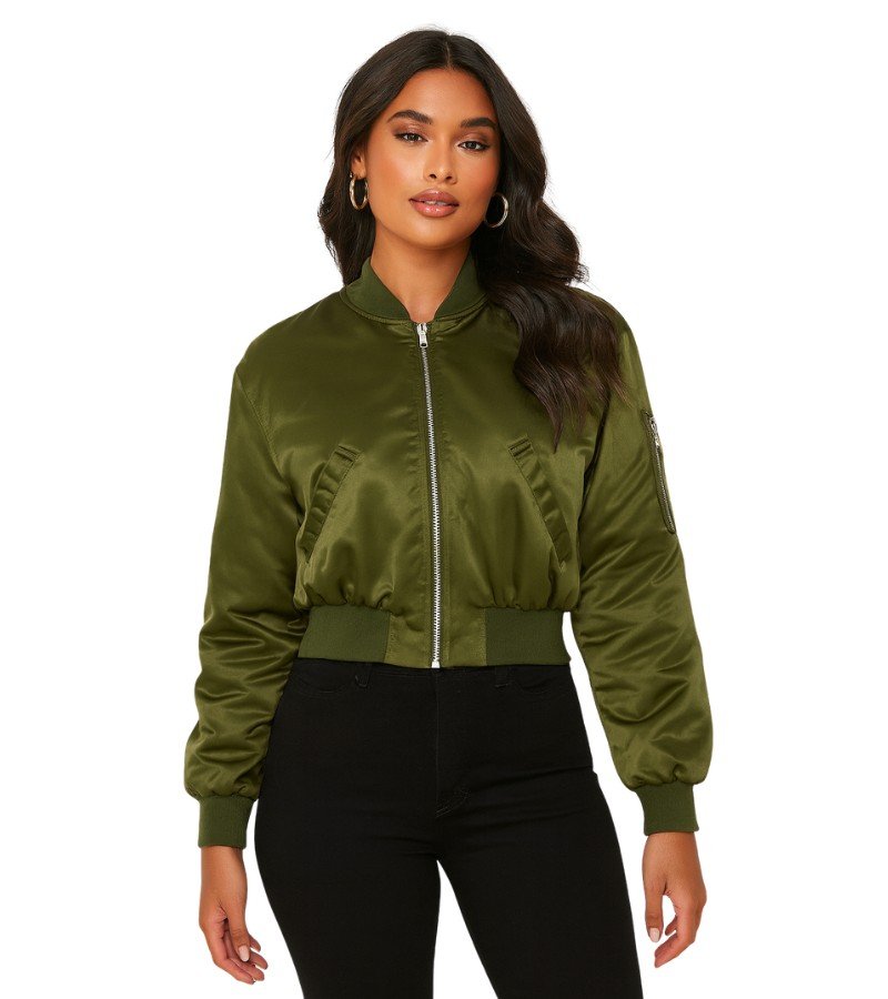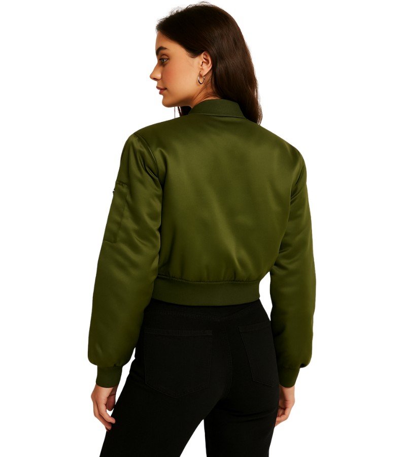 Elevate your casual style with our seamless Women’s Army Green Satin Bomber Jacket. It embodies a perfect combination of elegance, comfort, style, and versatility. Constructed from quality satin, the fabric’s smooth and soft shiny surface offers a stylish and contemporary finish. The army green shade offers a bold refined appeal giving it a timeless addition to your wardrobe. The jacket is crafted from lightweight and breathable satin fabric, ensuring all-day comfort during slightly cool evenings and pleasant spring temperatures. Moreover, its soft texture and relaxed fit make it ideal for both style and ease. Whether you’re working, running errands, or meeting friends, this jacket effortlessly complements your look. Additionally, it offers a perfect balance between a trendy appearance and everyday practicality.